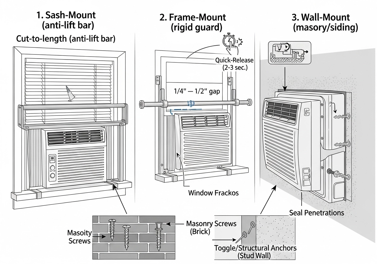 A good AC window bar gives you a physical stop so the sash can’t be forced upward or outward to yank the unit free, and it stiffens the installation so the AC can’t be wiggled out by leverage. What it doesn’t do is block airflow or lock you in. The modern approach is a bar that secures the opening while coexisting with quick-release hardware on at least one window in each sleeping area—so you preserve emergency egress.